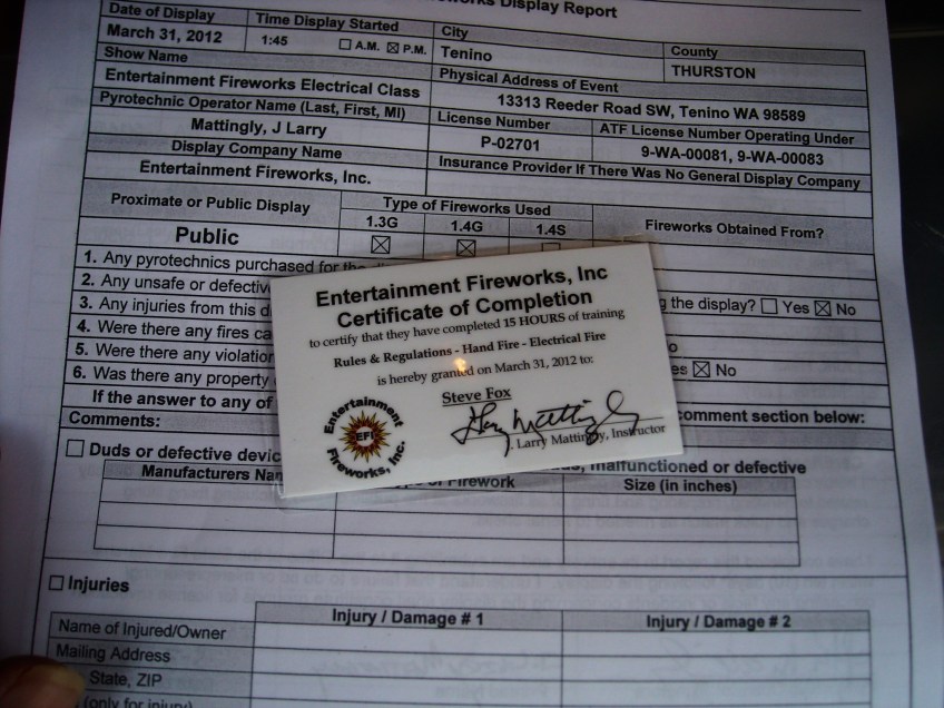 2012-03-31 55 Published April 1, 2012 at 2048 × 1536 in Pyro School: Finale My training card sits atop my copy of the show report. Share the pain: Click to email a link to a friend (Opens in new window) Email Like Loading...