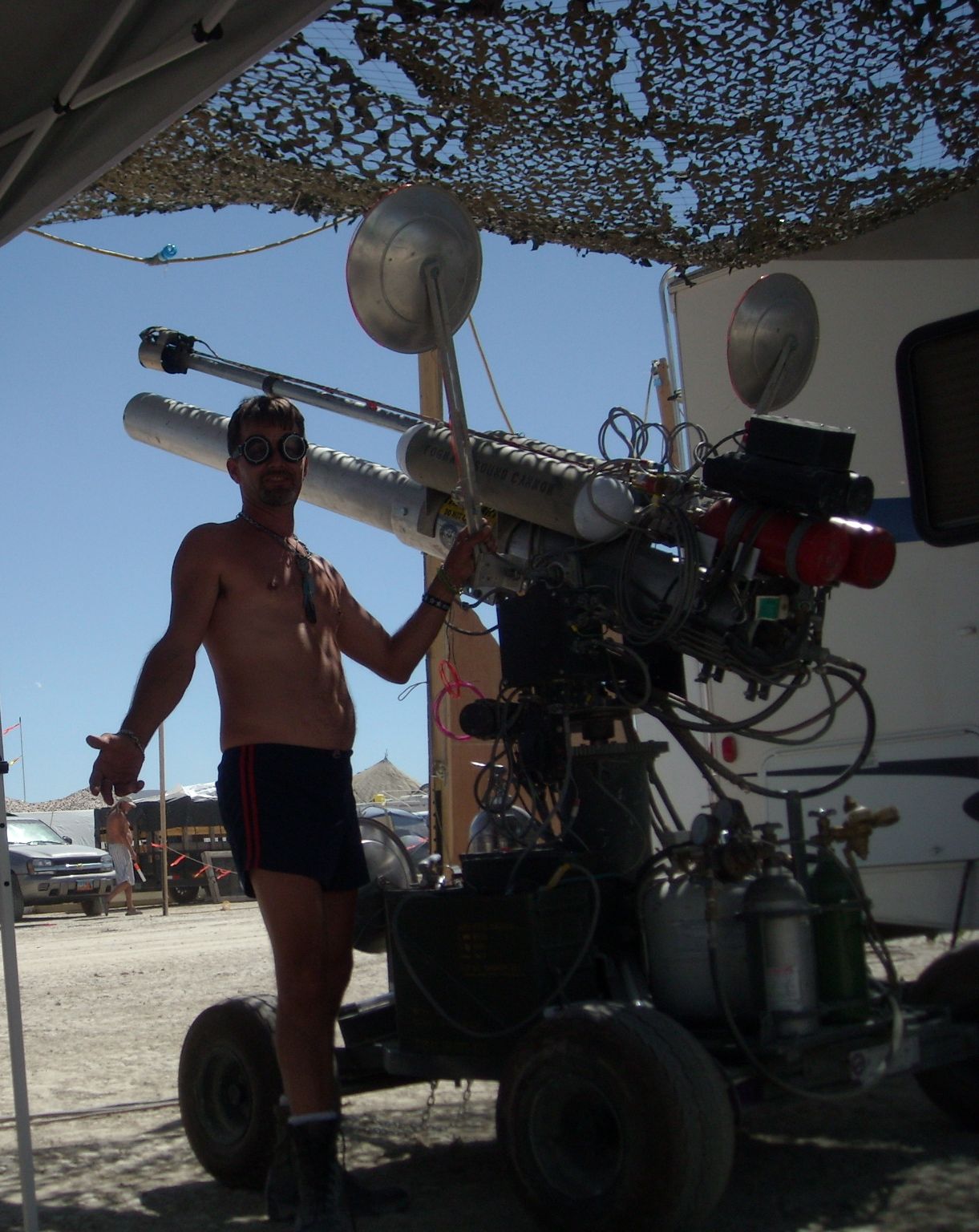We, Captain Smashy, Espressodude, Helga, Wally (the Anubis pyro lead), and I among others (Oh yeah! A very pretty gal wearing just boots, a skirt, and a smile, yay!), composed the Arson Crew tasked with burning the dog. We spent the better part of Friday building, loading, and wiring the various pyro devices. Jack, the head of Black Rock FX, delivered the pyro to us, made suggestions, gave direction, and lined out a path of continuity for us. Then he said GO!