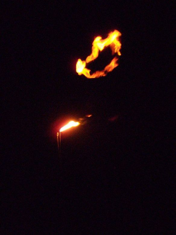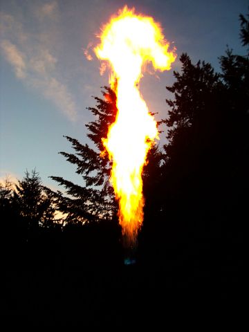The methanol buckets. 5 gallon buckets with electrically-ignited marine distress flares in the bottom were lined with trash bags and filled with methanol (wood alcohol). When the flares ignited, the meth bags burned through releasing a cascade of burning fuel through the hole in the side of the bucket where the flare was inserted. The methanol was mixed with various chemicals that gave the otherwise colorless flames some panache. There were several meth cues over the next minute.
