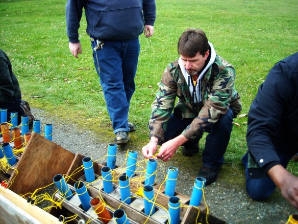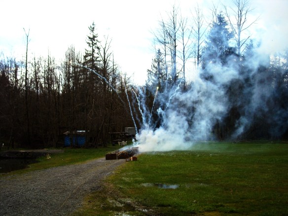 About now the mine bags started blowing. These were trash bags filled with leftover bits of fuse, stars, comets, small class C devices, and other pyro floor sweepings. Lots of crazy, delicious, dangerous shit wrapped up like tea bags. They were nailed to the exterior and not matched (fused). They depended on the kindness of wayward flames to light ’em up.