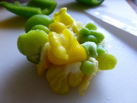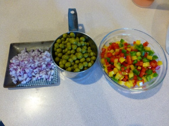 Free the tofu from its plastic prison and slap it on a plate. Place another plate on top of Mr. Tofu and put a few cans on top to press it down a bit. It Mr. T starts to crumble, I pity you, fool. The idea here is to press lots of water out of the tofu so it will be able to soak up the yummy dressing it will eventually be bathed in. The ‘fu will need to be squeezed for up to an hour. Pour off the expelled ‘fu juices every 15 minutes or so. After draining, cut it up into 1/2 to 3/4 inch cubes.